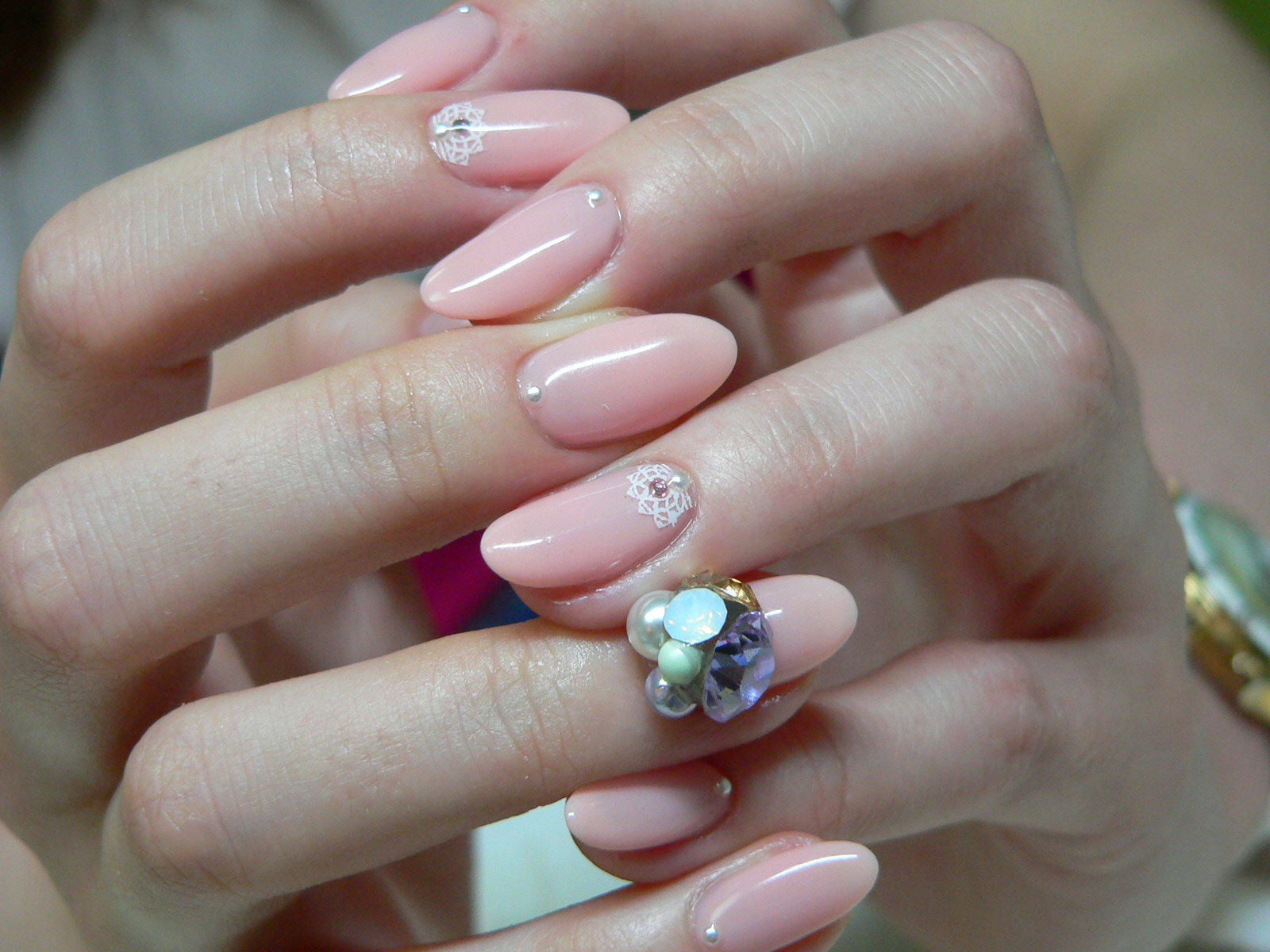 ハンドは優しいベビーピンクのワンカラー塗り。ちょこっとレースシールをプラスして♡