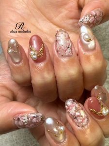 ゴールドミラーとパールのアクセントが、大人のお洒落ネイルを演出してくれます。