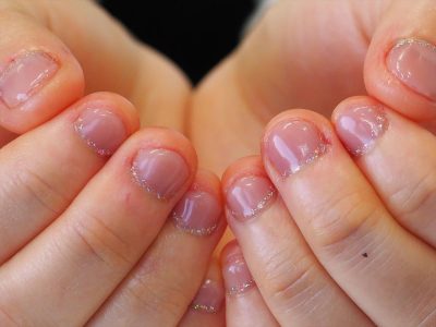 初めてジェルネイルをされるお客様。お爪が少し伸びただけで、白い爪先部分を裂いてしまう癖があるそうです。