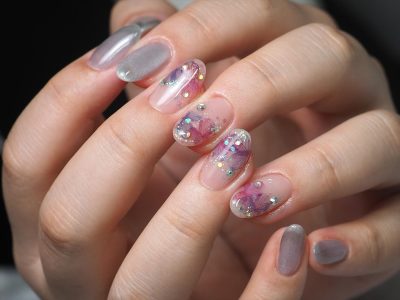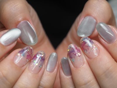 本日はお持ち込みシールの紫陽花風ネイルをご依頼頂きました。