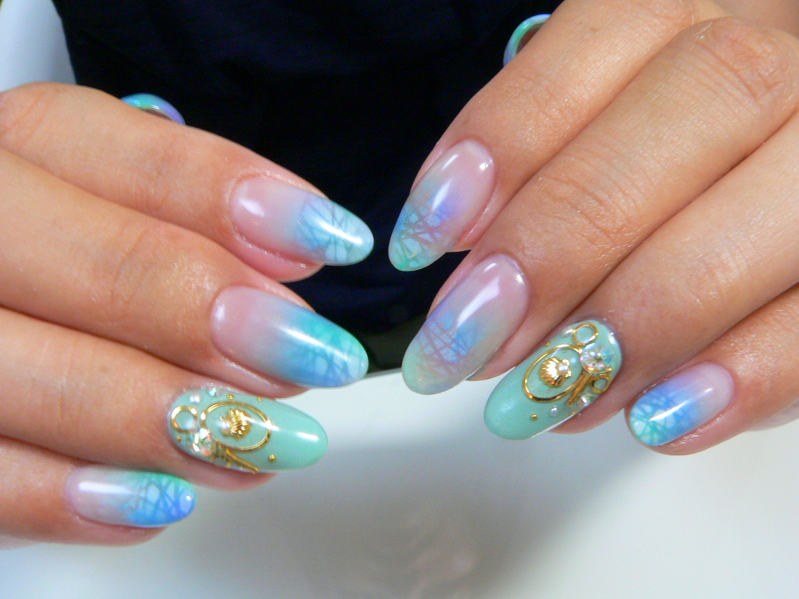 エアブラシ4色を使用して、メッシュ柄にしました。 SEAパーツが、夏ネイルを盛り上げます♬