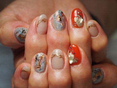 天然石ネイルと、ベージュゴールドミラーの相性が良くてリゾート気分を上げてくれます。