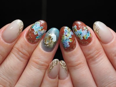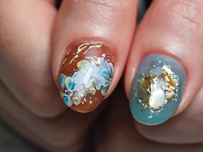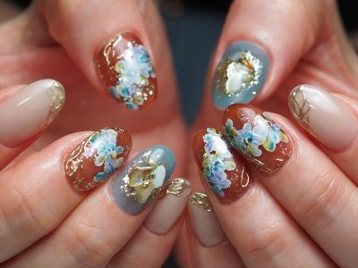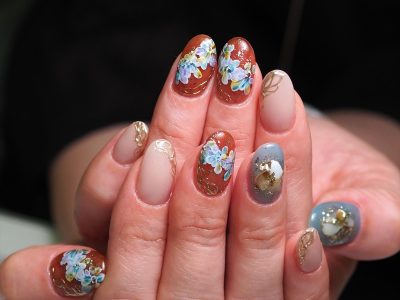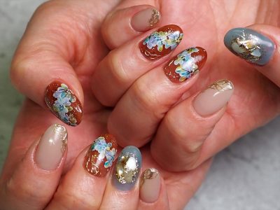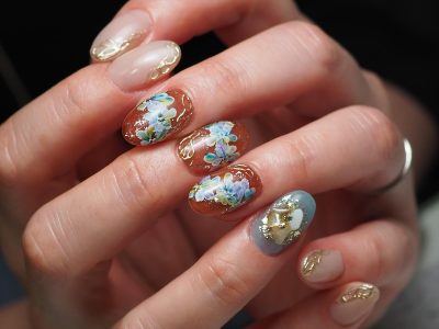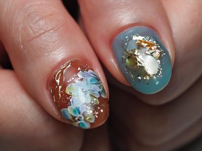 ブルー系カラーでフラワーネイル。