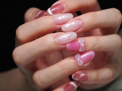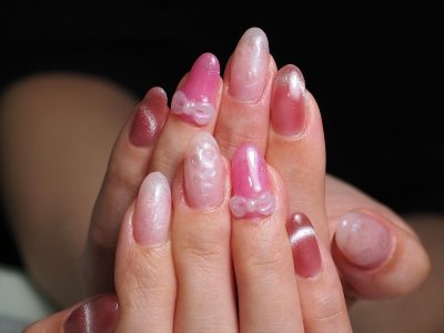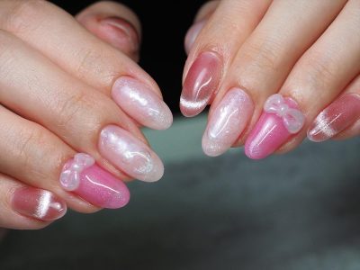 粘土ジェルで作ったリボンを添えて、大人気のマグネットフレンチも入れて、イマドキいっぱいネイル(^^♪
