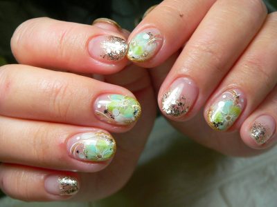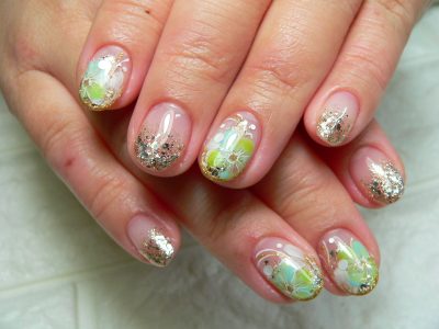 ライムカラー、ライトブルー、ホワイトの爽やかフラワーネイル。