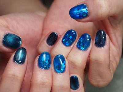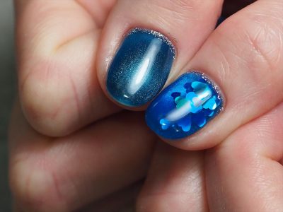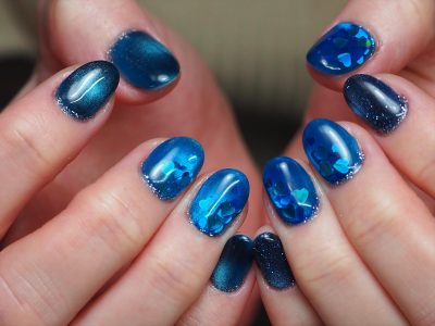 SILVERと水色のハートホログラムを奥行きが出るように配置して、BLUEクリアジェルでコーティング♥