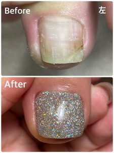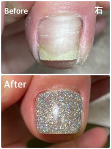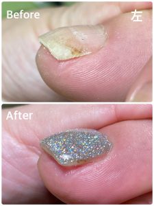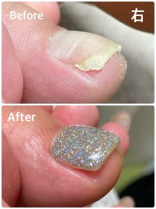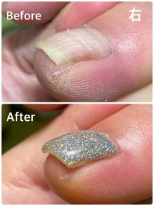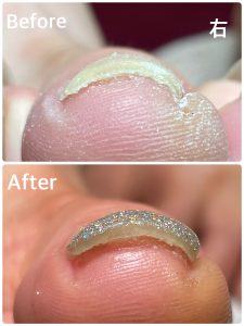 写真のbefore&afterを見ると痛感するのは、本来の正常なお爪の位置や幅がここなんだという事がわかりますね。