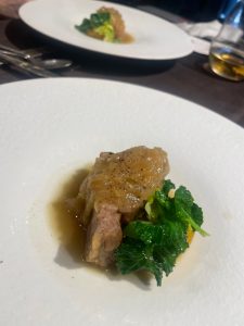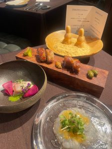 鰆のハム、熊野和牛のローストビーフと茄子、牛頰肉のプレゼ、ブダイの炙り、菜の花ソース、