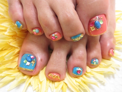 今回も、夏本番らしくエスニックテイストが入ったターコイズ・ペディキュア仕上げ