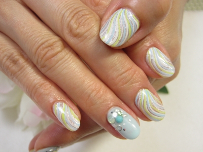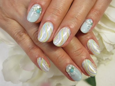 パール粒子のベースに、アクリル絵の具の黄緑・水色・白で流れるような曲線を描きました