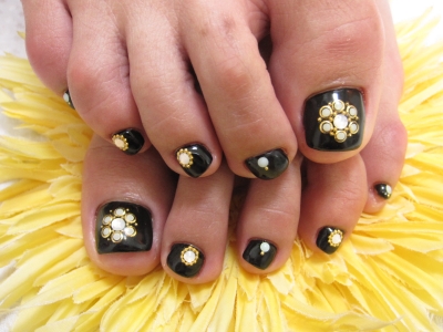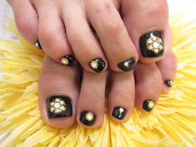 本日のネイルは、家紋のようなデザインが映えたブラック・ペディ