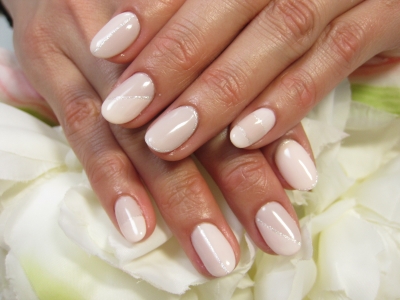 本日は、クリームホワイトカラーの逆フレンチに、クリアピンクのラメを施しました
