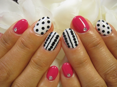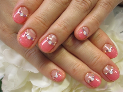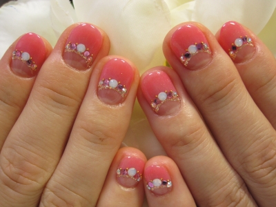 本日は、イチゴカラーで逆フレンチにして、ストーンをティアラ風に並べてみました