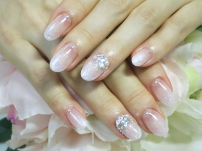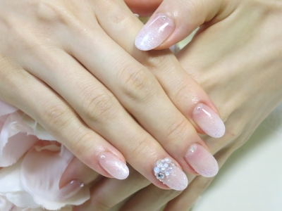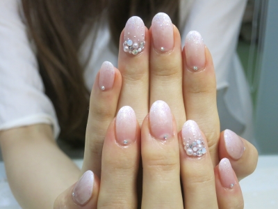 ホワイトパールの薄めグラデーションに、先端極薄めの細かいピンクラメを施しました