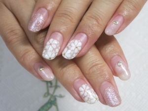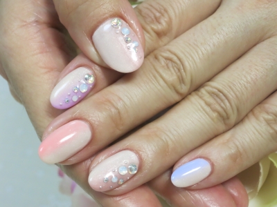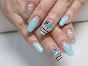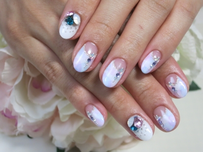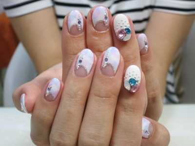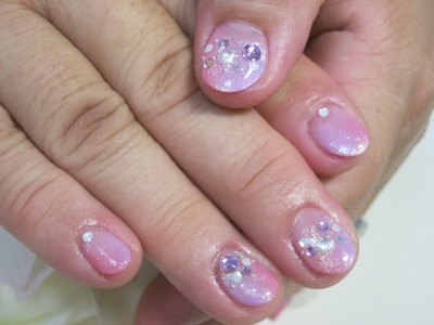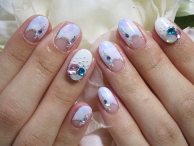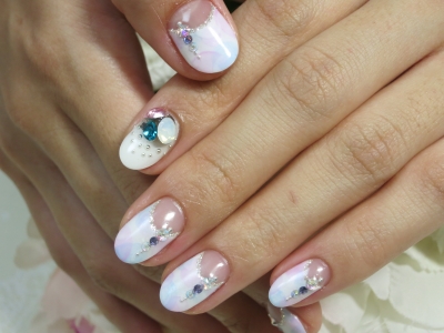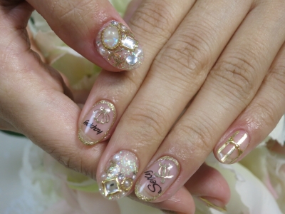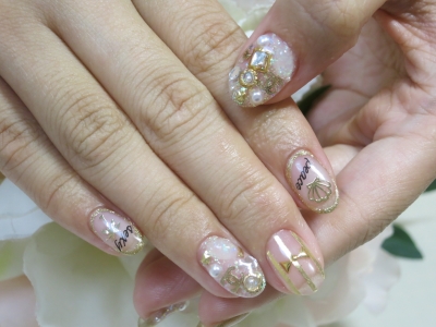 クリアの透け感を生かして、ゴールドやパール系のストーンで涼しく仕上げます