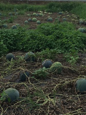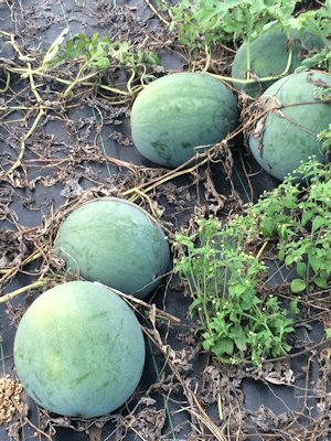 縞々模様は、赤色スイカ。緑の無地は、黄色いスイカだよ