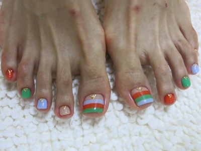 ボーダーに、海の中のサンゴが散らばっているイメージで爽やかネイルに仕上がりました