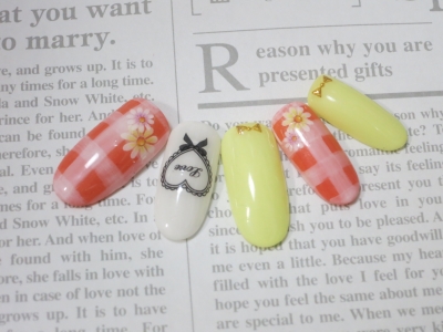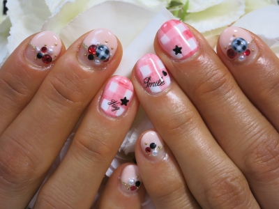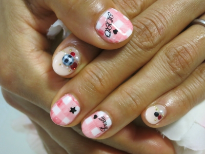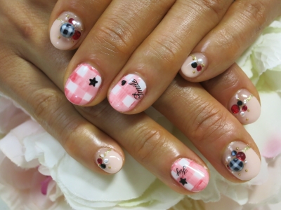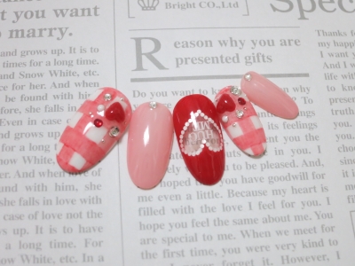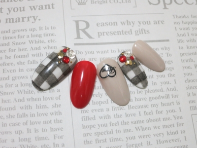 赤のギンガムチェックに、ベージュのストレートフレンチでまとめました