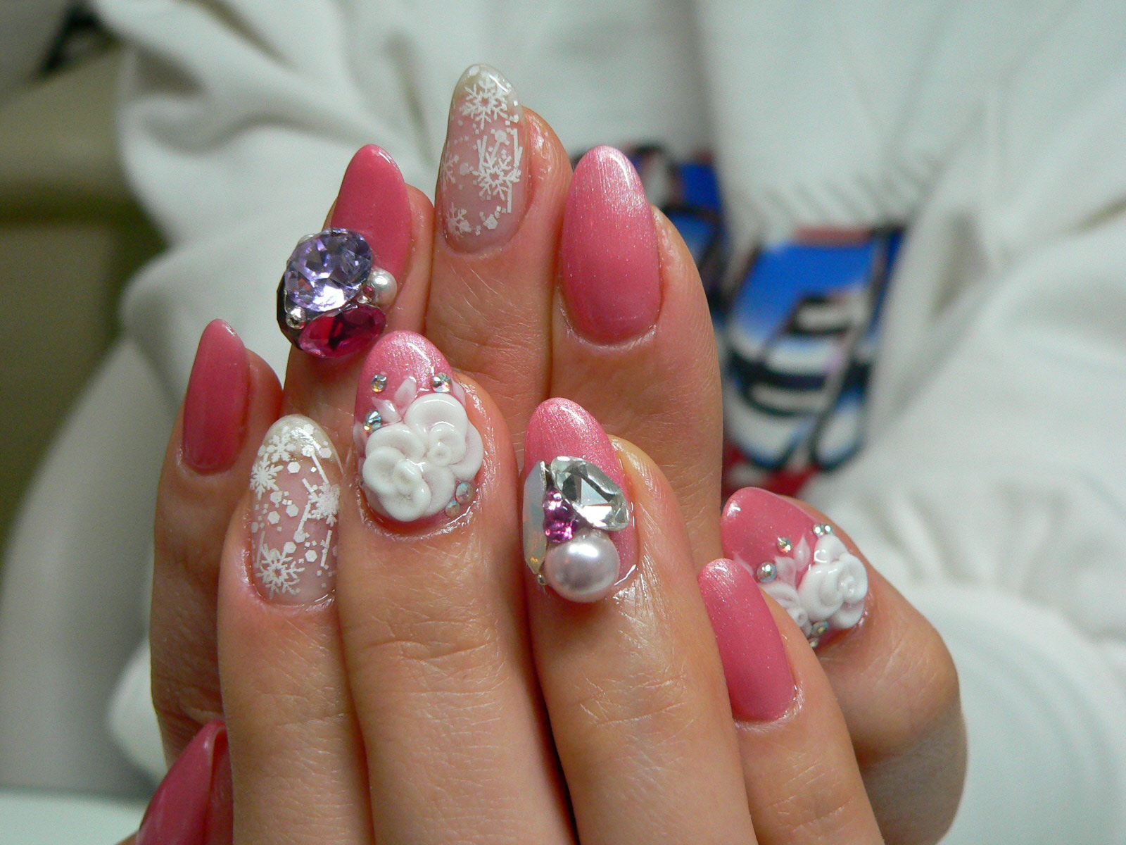 ⇒雪結晶2本ON ⇒ジェルTOP ⇒3Dビジューのトレプロ4デザイン2本 ⇒写真撮影 ⇒お会計まで!!!
