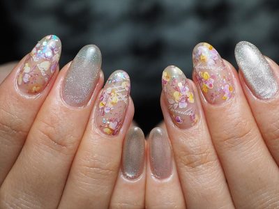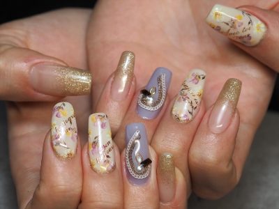 他店で付けたネイルは、キティちゃんパーツやリボンやストーンや黒バラやツイードや盛りだくさんネイルをされていました。