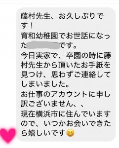 幼稚園教諭時代の3歳児・いちご3組の教え子(男子)から嬉しいメッセージが♡♡♡