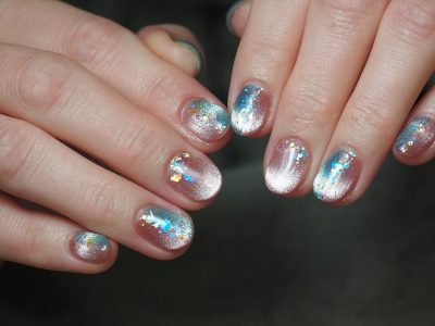 本日は新入荷のマグネットジェルを贅沢ハーフ&ハーフ使いしたキラキラネイル