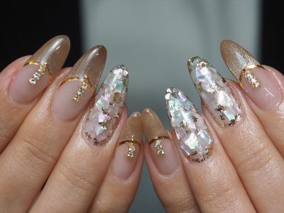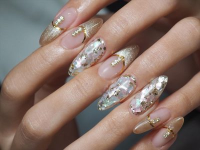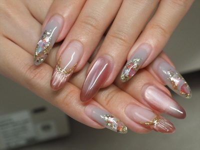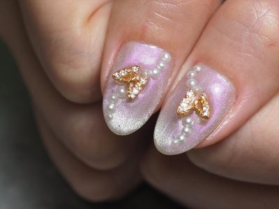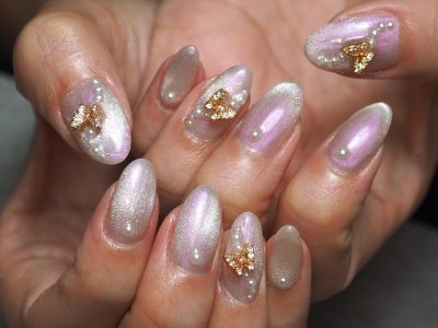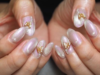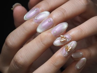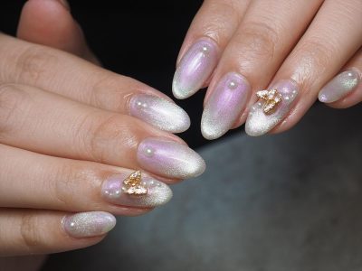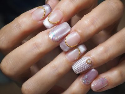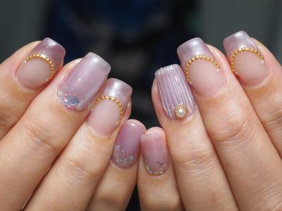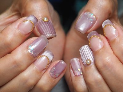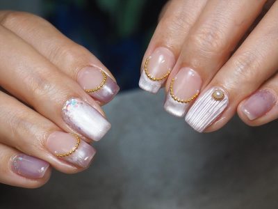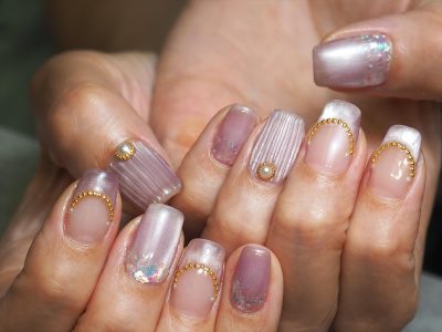ボールチェーンでカジュアルさも出しつつ、淡いラベンダーピンクにクリアホロラメを散らばしました。