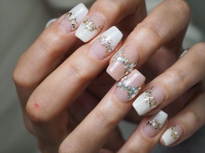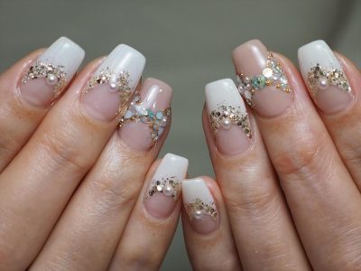 リボンみたいなビジューの置き方が可愛い、きらきらビジューネイル☆