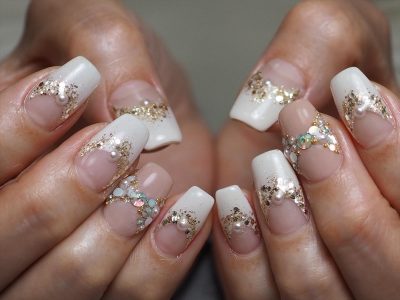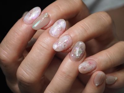 オーロラフレーク2種をランダムにONして、透明感残すきらきらオーロラニュアンスネイル★