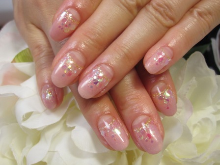 ピンクカラーをベースに、生え際にラメ&セロファンの透明ピンクホログラムを散りばめました