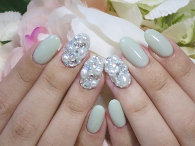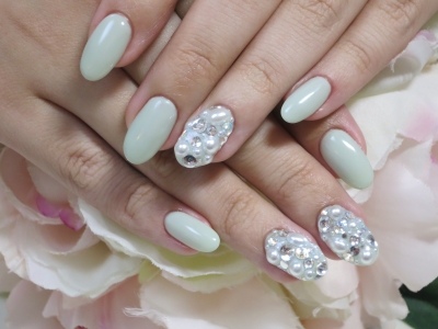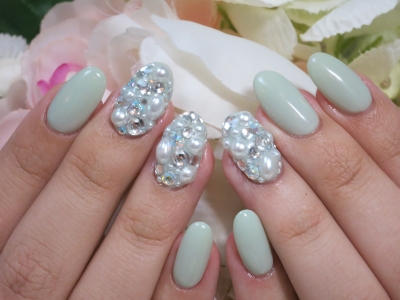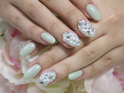 モスミントの単色塗りに、1点豪華主義のキラキラビジューアートをオン
